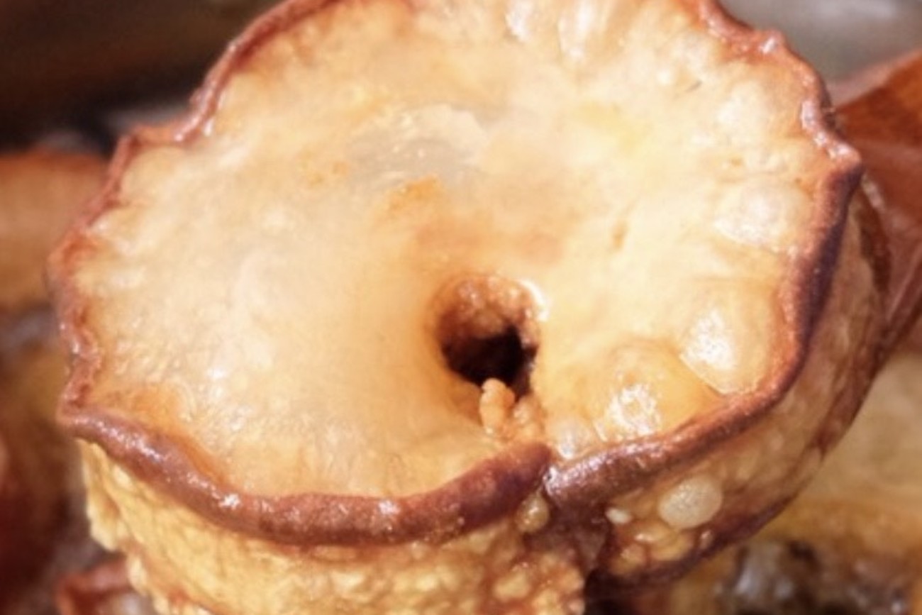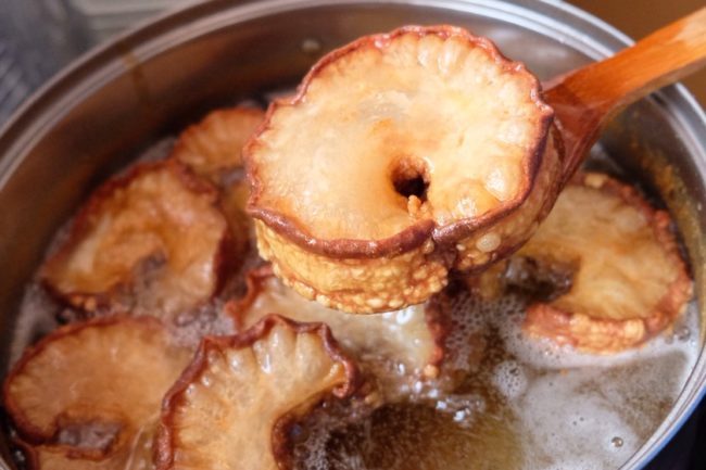 材料に使用しているのが、オーストラリア産の牛の膜付き小腸。独自の製法+長時間揚げる事で